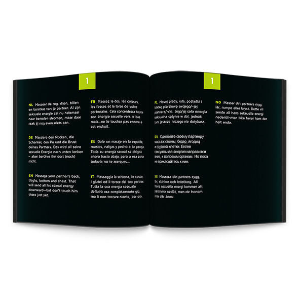 The 24 challenges of the Foreplay edition are available in 10 languages: English, Spanish, French, German, Dutch, Polish, Russian, Italian, Swedish and Norwegian, and will undoubtedly bring you to a climax that you have not experienced before. Are you naughty enough to take the plunge? Let yourself be surprised, excited and attracted, and above all, take the time to enjoy each other. Have fun!